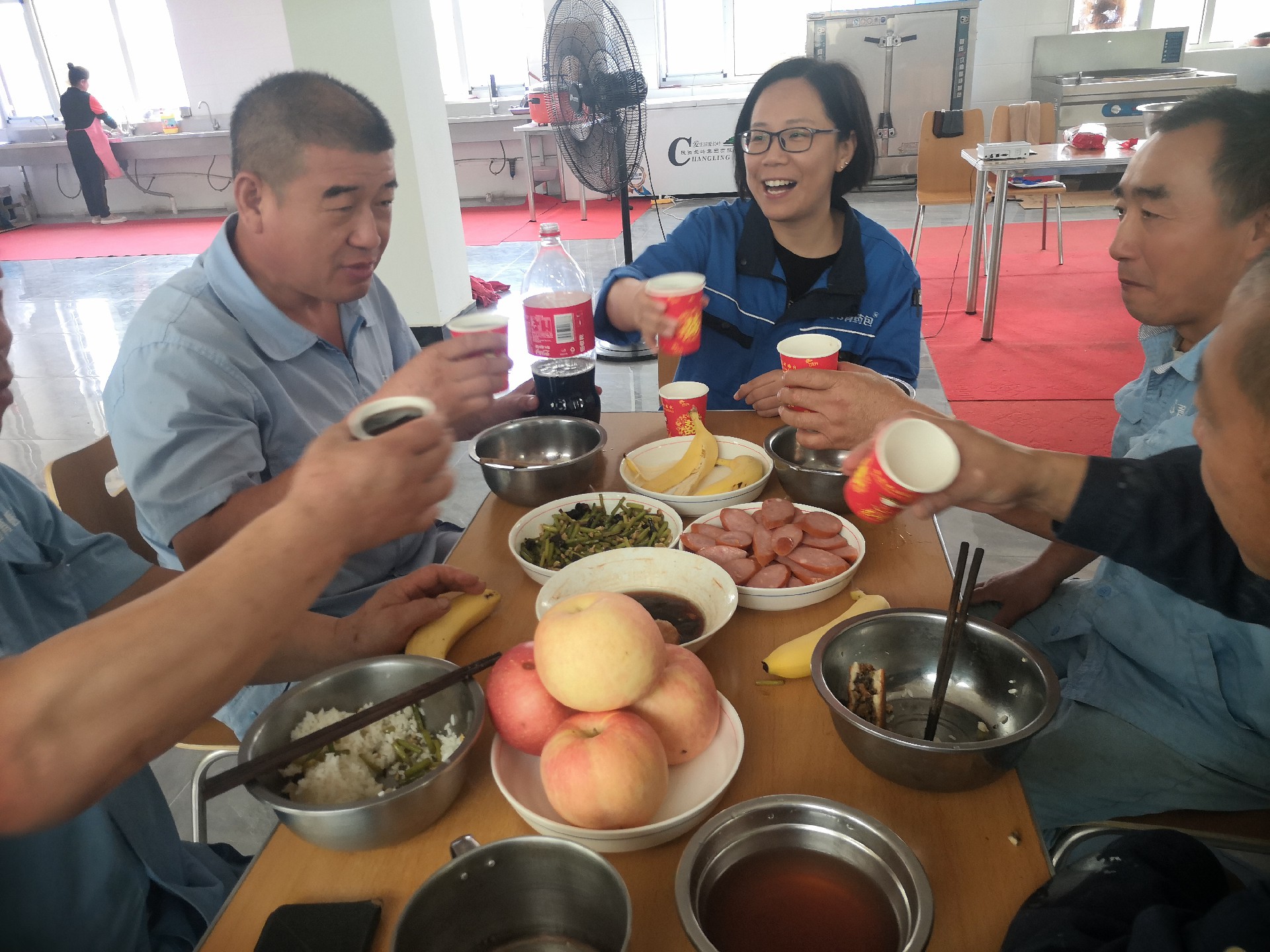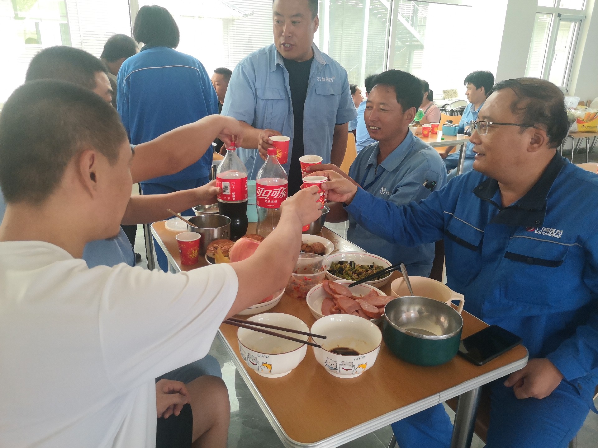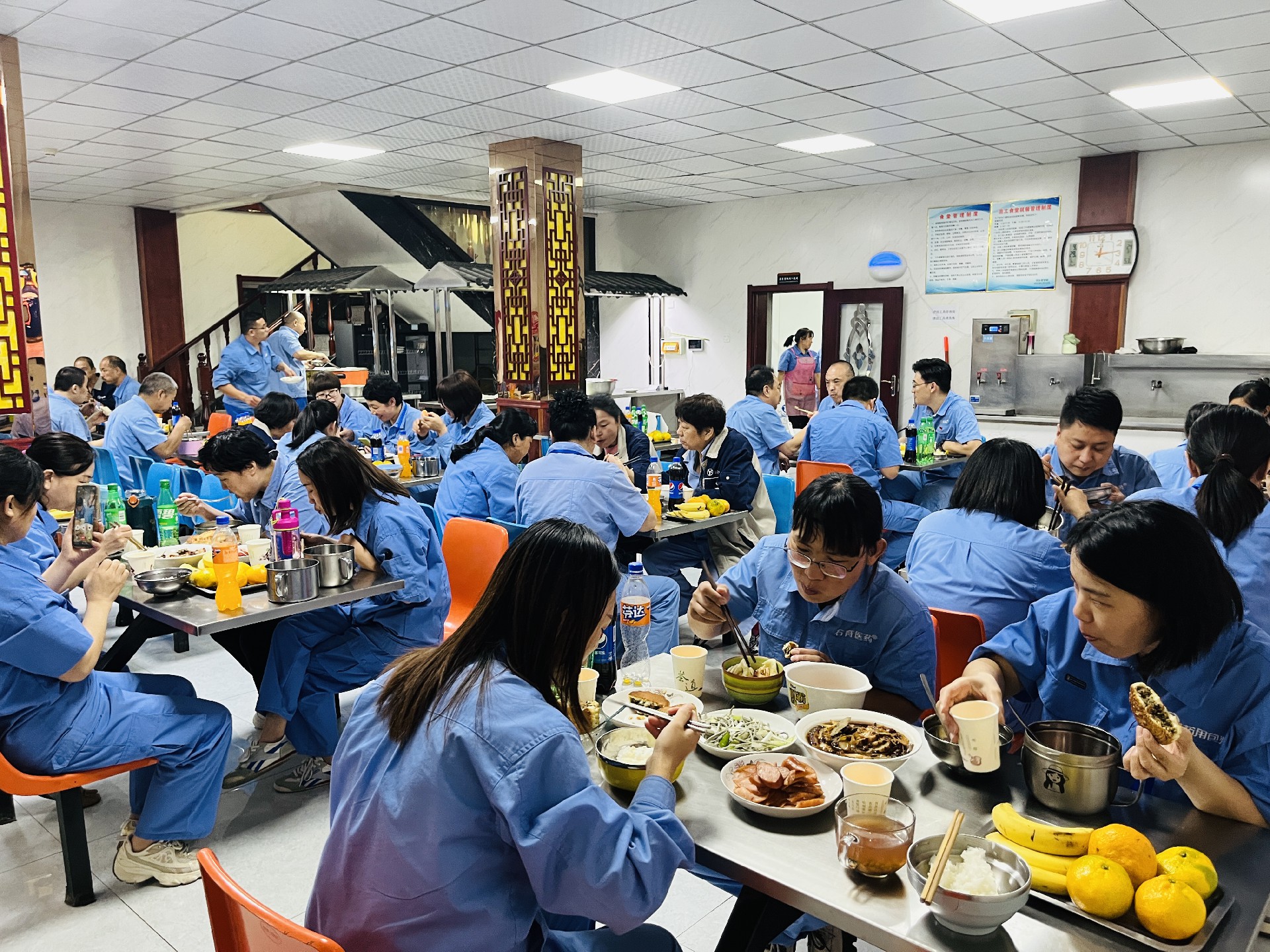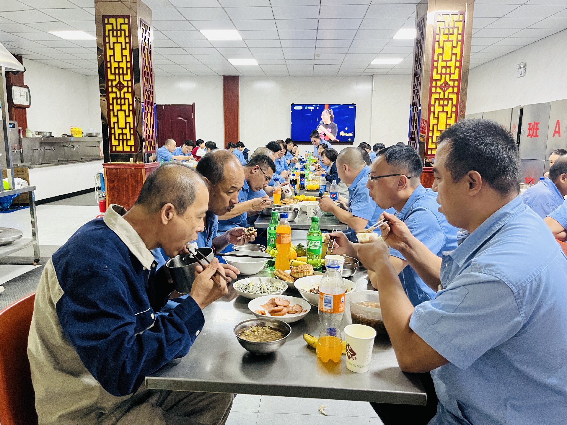 2023年9月29日,石育兩廠區(qū)在崗職工在食堂共慶雙節(jié)